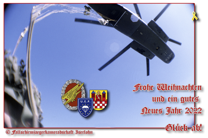 Im Februar fand unser erstes Kameradschaftstreffen im Jahr 2022 statt. Die Teilnehmer freuten sich über eine Mund-Nase-Bedeckung mit Schriftzug "Glück ab" und dem jeweiligen ehemaligen Fallschirmjägerbataillon. Wir danken dem Kameradschaftsleiter für die edle Spende. Das Treffen der Fallschirmjägerkameradschaft Iserlohn Mitte Mai war gut besucht und es konnte ein neues Mitglied bei seinem ersten Besuch begrüßt werden.